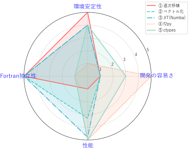 ③ JIT (Numba) 「完全移行」方針における現実的かつ強力な選択肢です。元のPythonロジックをほぼ変更せず、デコレータを追加するだけでFortranに近い性能を達成できる可能性があります。小規模計算でのオーバーヘッドは弱点ですが、それを補って余りあるメリットがあります。