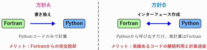 実績のあるFortranの計算ルーチンを、Pythonから呼び出せるようにし、高性能な「計算部品」としてPythonから活用するアプローチです。