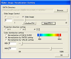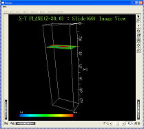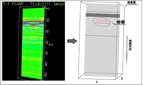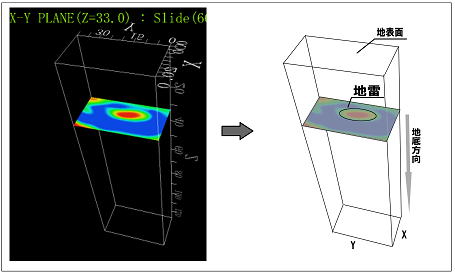 地雷探査エクスプローラは高分解能地雷探査レーダーから受け取ったデータファイルを読み込み、地中のどの位置に地雷が埋もれているかを可視化します。高分解能地雷探査レーダーのデータは任意の断層ごとに採取されます。地雷探査エクスプローラはこれらの各断層データを集めた上で、地中内をスライス画像により表示し、地雷が存在する3次元的な位置を色の変化で認識できるようにしています。