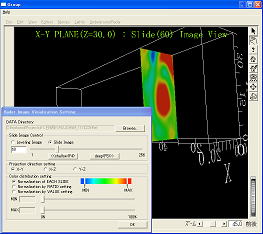 地雷探査エクスプローラの開発では、可視化機能の開発に加え、特に地雷除去作業にあたる人が簡単に操作可能なユーザインターフェースの開発を電気通信大学の荒井研究チームの皆様に貴重なご意見をもとに行いました。その為、操作パネルは直感的に理解できるものとなり、最も利用頻度が高いと思われるスライス面の移動はファンクションキーにより変更可能でよりスムーズな操作を実現しています。