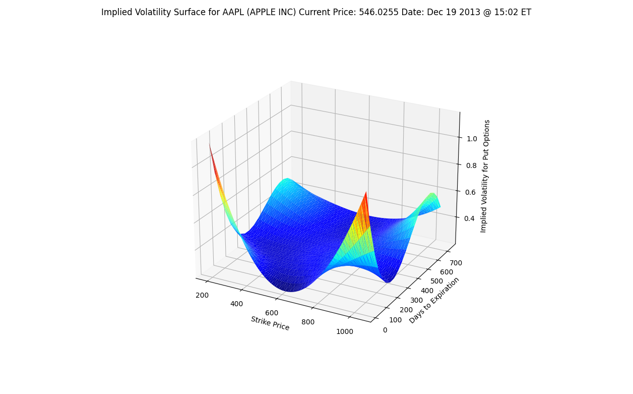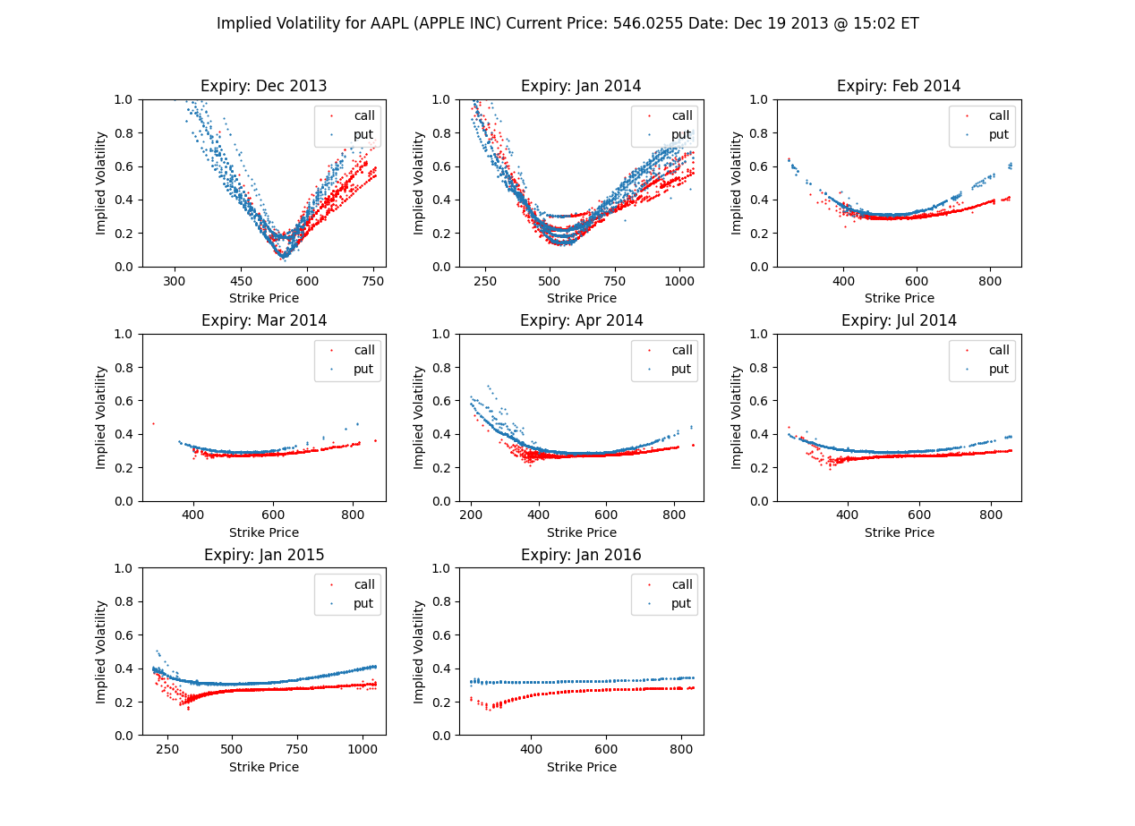 Implied Volatility for AAPL (APPLE INC),546.0255,-4.7445, Dec 19 2013 @ 15:02 ET,Bid,545.97,Ask,546.09,Size,2×1,Vol,8897300,