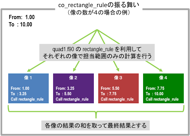 co_rectangle_ruleは積分の範囲と像の数、及び自身の像番号を用いて、自身が担当する計算範囲を得て、