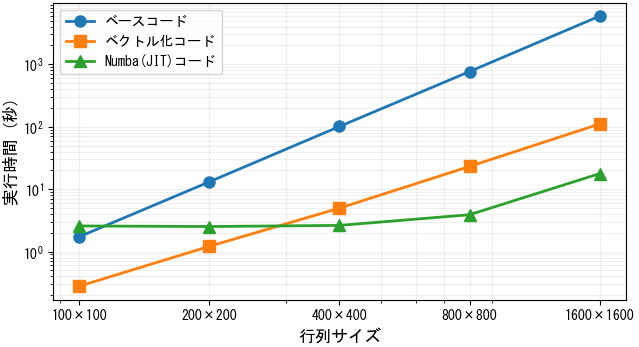 | 行列サイズ | 逐次移植ベースコード | ベクトル化コード | Numba(JIT)コード |