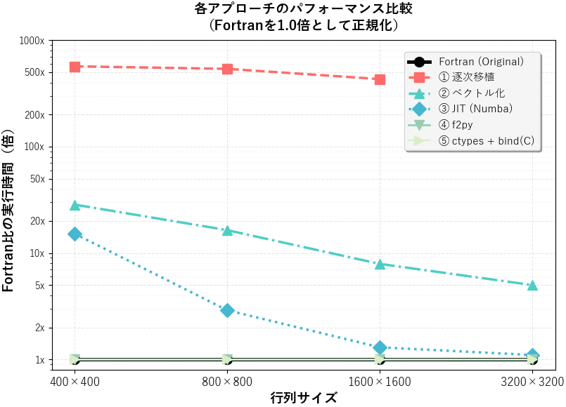 下表は、オリジナルのFortran版を基準(1.0x)として、各アプローチの実行時間が何倍になったかを示しています。数値が小さいほど、Fortranの性能に近いことを意味します。
