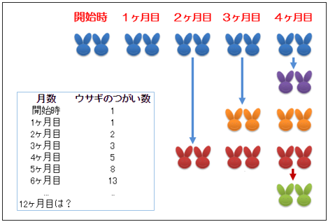 ここでは以下のウサギのつがいの問題を考えます。「生まれたばかりのウサギが1対いる。ウサギは生後2ヶ月から毎月一対の子供を生む。 どのウサギも死なないと仮定した場合、1年後には何対のウサギがいるか。」