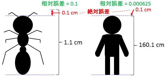ここで一つの例を考えてみます。 ある人の身長の真の値が160cmである場合に測定値として160.1cmが得られたとします。 この場合の絶対誤差は0.1cmです。同様に蟻の場合を考えて見ます。 蟻の身長の真の値が1cmで、測定値として1.1cmが得られた場合も、絶対誤差は同じ0.1cmです。