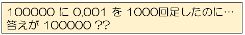 例えば以下のコード例では100000と0.001を1000回足してその結果を表示していますが、 絶対値の小さい数字0.001の足し算が結果に反映されていません。(正しい答えは100001)