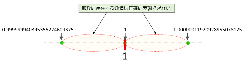 コンピュータの内部表現ではこの例のように0.999999940395355224609375と1の間及び1と1.00000011920928955078125の間に存在する無数の実数を正確に表すことができません。