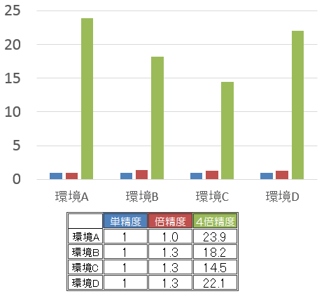 | 単精度を1とした場合の実行時間(単位=倍) |