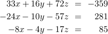 実行例: 3 33 16 72 -24 -10 -57 -8 -4 -17 -359 281 85 Solution 1.0000 -2.0000 -5.0000