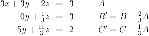 上記で説明した手順通りA式を用いてB式とC式からxを消去することを考えます。 A式を用いてB式から x を消去するにはB式からA式×2/3を引きます。 同様にC式から x を消去するにはC式からA式×1/3を引きます。 すると以下のような結果が得られます。