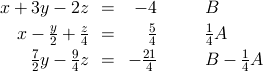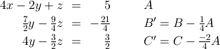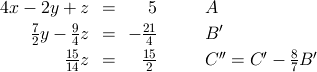 同様のやり方でC式から x を消去するためにC式からA式×(-2/4)を引きます。