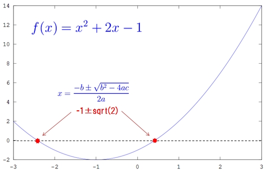 - この例題は2次方程式ですので、解の公式により求めた答え( -1±sqrt(2) )も合わせて出力して下さい