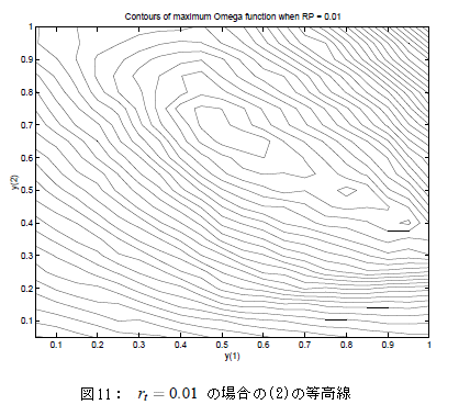 初めに限界利益率 rt=0.01 とし、(2) で ρ=2 を使用します。図11は (2) の等高線を示しています。(これらの等高線の波状の性質は、図8-10 の累積分布関数が滑らかでなく、そのためΩの計算に含まれる数値積分が投資比率の変化のように滑らかには変化しないということを表しています。)