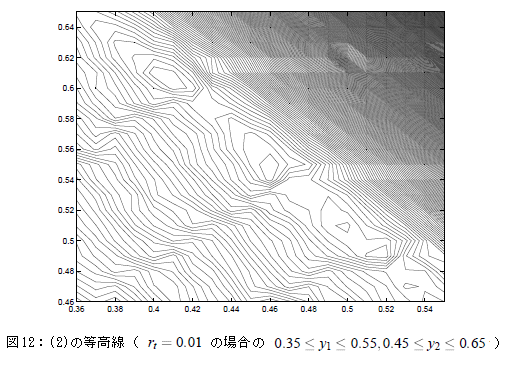 図12はこれらの局所解の範囲内にある(2)の等高線のプロットを示しており、結果の妥当性を裏付けています。