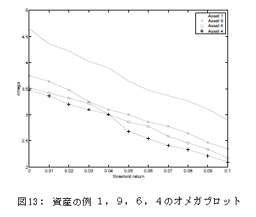 明確にするために、4つのグループのΩプロットを示します。図13 は4つの最も高いΩ曲線を示しています。資産1は範囲0≤rt≤0.1 で一貫して限界利益率の最良のΩ値を与えます。資産6と4の曲線は rt=0.04% に近く、資産6と9の曲線は rt=0.03% に近いですが、資産9、6と4はΩに関して次に最良な実績の資産で、この順で一貫してランク付けされています。