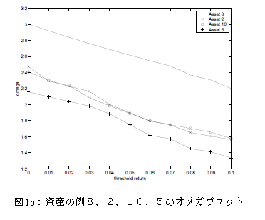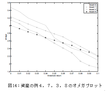 図14 は資産4、7、3と8のΩプロットを示しています。これらの資産の間のランクには rtが増加するにつれていくらか変化があります。例えば、資産8は rtがゼロに近いときに最も悪い実績でしたが、rtが 0.1% に達するにつれてこのグループの最良の実績である資産7にほとんど等しくなっています。