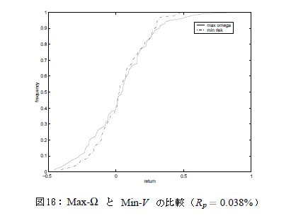 MAX-ΩとMin-V ポートフォリオの利益率の累積分布比較することは興味深いです。図16 は Rp=0.0038% の場合の2つの曲線を示しています。(Rpの他の値の図は一般にこの図と類似しています。)両方の曲線は中心部分でかなり似ていますが、Min-V ポートフォリオの点線の曲線は観測された利益率の範囲の上部末端に向かって短い尾部があります。