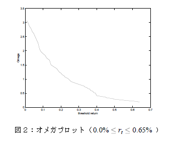 私たちはオメガ比率 [1] の使用についての調査に関して予備的な説明を行ってきました。オメガ比率は、(1) で定義されるようなオメガを最大化する投資比率を選択しようとするポートフォリオ選択に対する評価指標として使用されています。私たちは E05JBF を使用して生成される Max-Ωポートフォリオを検討し、よく知られた Markowitz 法を使用して生成されたポートフォリオと比較しました。小規模のサンプルの計算は、任意の資産について Max-Ωポートフォリオがリスクの最小化やダウンサイドリスクに基づくポートフォリオとは異なっていることを示唆しています。Max-Ωポートフォリオと最小リスクポートフォリオの実際の違いは、バックテストと実在の資産データを用いて調べる必要があります。