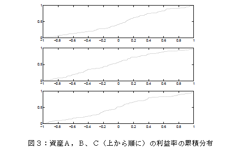 解が y3をゼロに設定するということは、図10の3つ目の資産の累積分布の形を見れば簡単に説明されます。この資産のΩ(0.01) の値が資産1と資産2の対応する値と比較して極めて小さいことは明白であり、従って資産3はΩの最大値を生み出すポートフォリオに貢献する可能性は低いです。