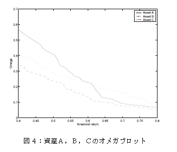 図4は Ω値が利益率の全ての値において高いため資産 A が常に資産 Bよりも好まれることを示しています。もし限界利益率が0.6%よりも低い場合、資産 A はまた資産 C よりも好まれます。しかし限界利益率が増加することによってこの状況は変わり、目標の利益率が0.6% と 0.8%の間の場合資産 C が最もすぐれた投資になります。