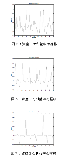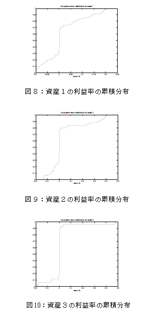 図5-7は50日の利益率の推移を示しています。図5は小規模の損益のあった資産に関係しています。図6,7は頻繁ではありませんが大きな損益を挙げる資産に対応しています。資産1,2、3に対する累積収益率分布は図8-11で示されています。