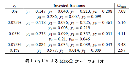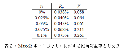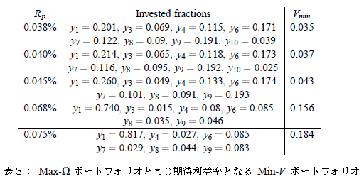 表2はポートフォリオの期待利益率 Rpとリスク V に関するMAX-Ωの解についてのより詳しい情報を表しています。
