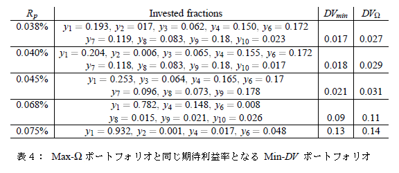 MAX-Ωの解の実線の曲線の長い尾部は、比率Ωを最大化するために(1)で定義された曲線の上の領域と下の領域を調整しようとしていることを反映しています。 Min-V ポートフォリオは予想ポートフォリオ利益率 Rpを上回る値と下回る値の偏差を最小化するために計算されます。 Max-Ωの解は一方でポートフォリオが限界利益率rt以上を得る可能性を高めることに関係しています。従って Max-Ωポートフォリオはダウンサイドリスク(値下がりリスク)を最小化するよう設計されたポートフォリオと共通点が多いことが予想されます。ダウンサイドリスクとは目標の利益より少ない利益しか得られないリスクです。表4は表2と3の Rpに対する ダウンサイドリスクDV を最小化することによって得られたポートフォリオを示しています。 表4は対応する Max-Ω解のダウンサイドリスクの値 DVΩを引用しています。