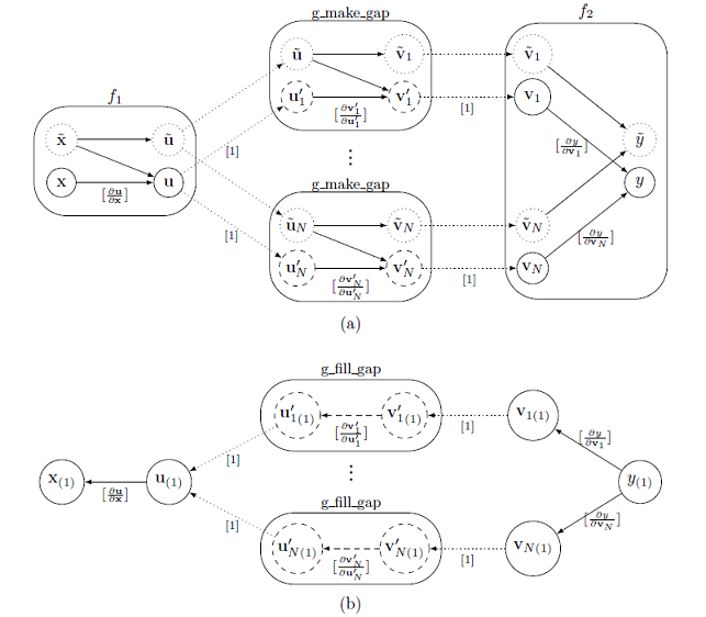 添え字 i の意味は逆向きのパスの考察で明らかになります:全ての $\mathbf{u}_i'$ が $\mathbf{u}$ の(パッシブ)値に等しいことに注意しましょう。g_make_gap は、g を計算した後は、EFO へ $(\mathbf{v}_i',\tilde{\mathbf{v}_i})$ を登録し、EFO は $\mathbf{v}_i'$ を新しい dco/c++ アジョイント型(アクティブ出力のみが dco/c++ 型へ変換されます)$\mathbf{v}_i$ へ挿入し、それらがテープに登録されます。よって、式 $(19)$ での g のアクティブ出力 $\mathbf{v}_i'$ は double 型で、$f_2$ の $\mathbf{v}_i$ は dco/c++ の一次アジョイント型です。結果的に、$f_1$ と $f_2$ の値は、g の呼出しが無い間はテープに記録されます。