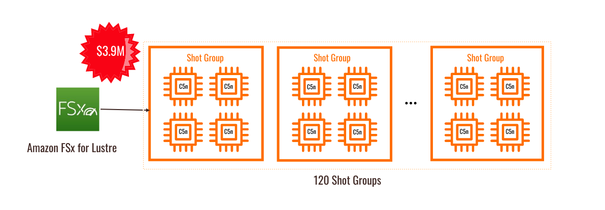 このアプリケーションの価格を左右する要因の 1 つは、大規模な共有ファイルシステムです。このアプリケーションでは、主に一時的なスクラッチスペースとして使用されています。各ショットには約 50TB のスクラッチスペースが必要です。各「ショット」は計算に依存しない問題なので、スクラッチスペースを共有ファイルシステムから取得する必要はありません。以前は、オンプレミスのシステムでは、それだけのデータを保存できる唯一の場所であったため、この方法で行われていました。