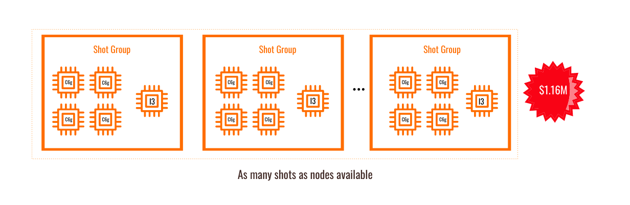 図3に示すように、各ショットは現在 4 つの ARM ベースの C6g インスタンスと I3en インスタンスのセットを使用しており、計算用のスクラッチスペースストレージを提供していることがわかります。ワークロードのボトルネックに対処するために計算機能を追加したため、ランタイムは劇的に短縮されました(ショットごとの再構成時間は6時間に短縮され、120 ショットを同時に実行した場合、ジョブ全体を 21 日で終了させることができます)。クラウドリソースを追加し、トータルコストを削減しました。