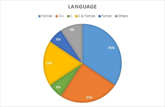 この結果は他の学術分野のコードと類似しています。注目される点はC++がCとFortranを合わせた分と同程度あることです。Pythonを用いるコードが少数有りますが、通常はアプリケーションのバックボーンでない場合が多いです。"Others"についてはC,C++,Fortranの組み合わせを表します。