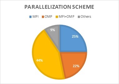 これまでのPOPプロジェクトにおいて最も多い並列モデルは、ハイブリッドMPI+OpenMPです。