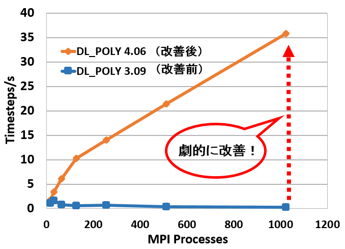 スケーラビリティーの改善例 DL_POLY(分子動力学シミュレーション)の事例 |