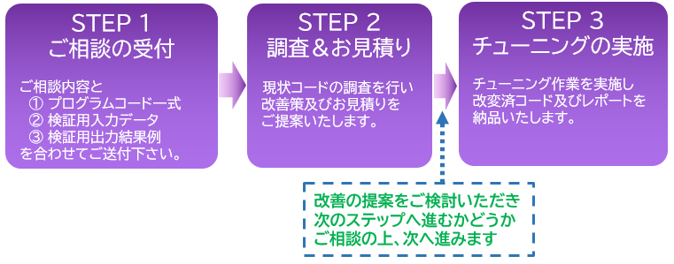 - 概算見積では、無償でお客様コードの概要プロファイリングを行い、概算見積額に合わせて可能な改善策をご提示します。ただしコードの複雑性によっては、概要調査では改善策が判明せず概算見積が困難な場合があります。この場合は、別途ご連絡させていただきます。