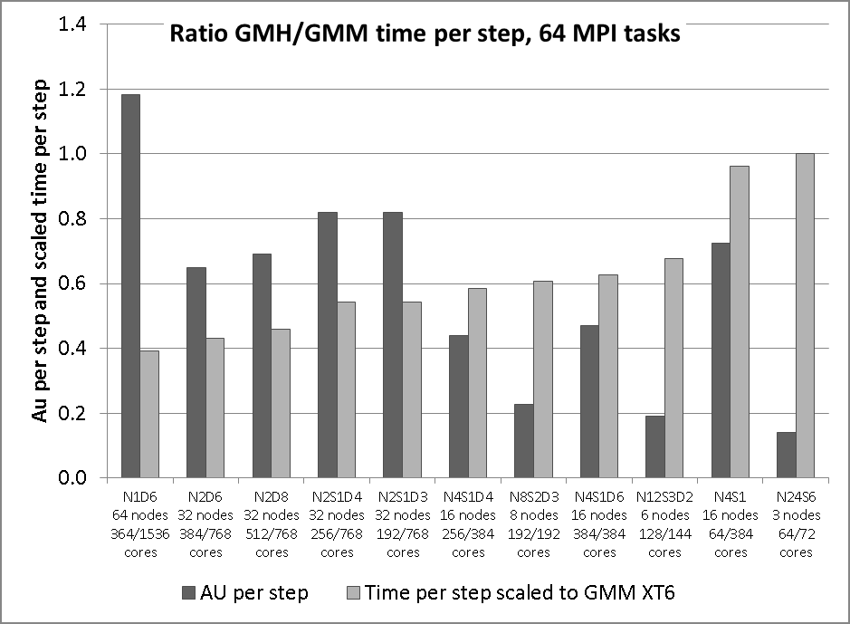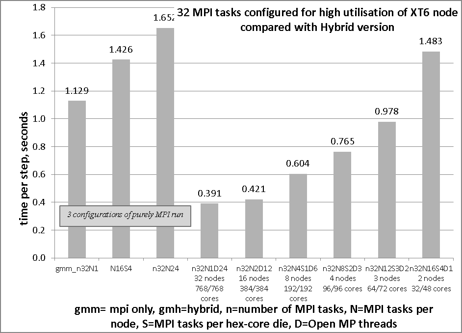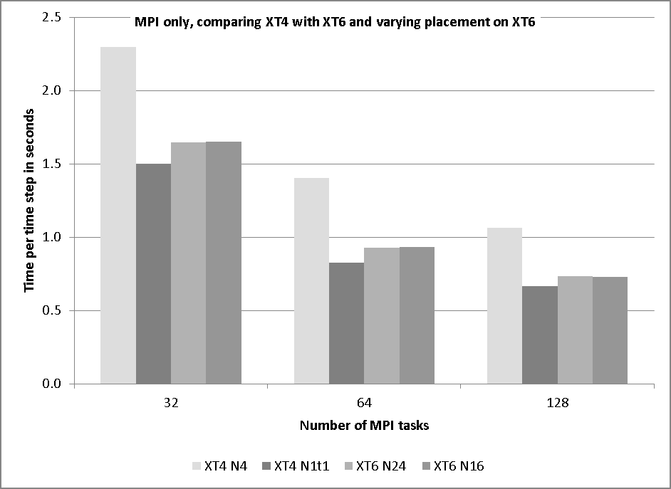 MPI-onlyモードでは、32タスクと64タスクには最適配置が存在します。これはステップ時間に掛かる課金をベースにしたもので、アイドルするコアを残した状態で(それでも課金されます)、実行時間はキャッシュとメモリーパスにより影響されるためです。ヘキサコア・ダイはノードメモリーが32GBであり、コア当たり利用可能なメモリーがXT4hの2GBから1.3GBへ減少しています。