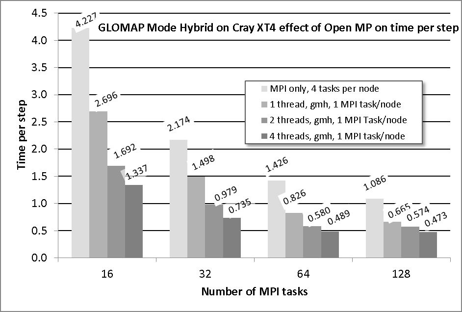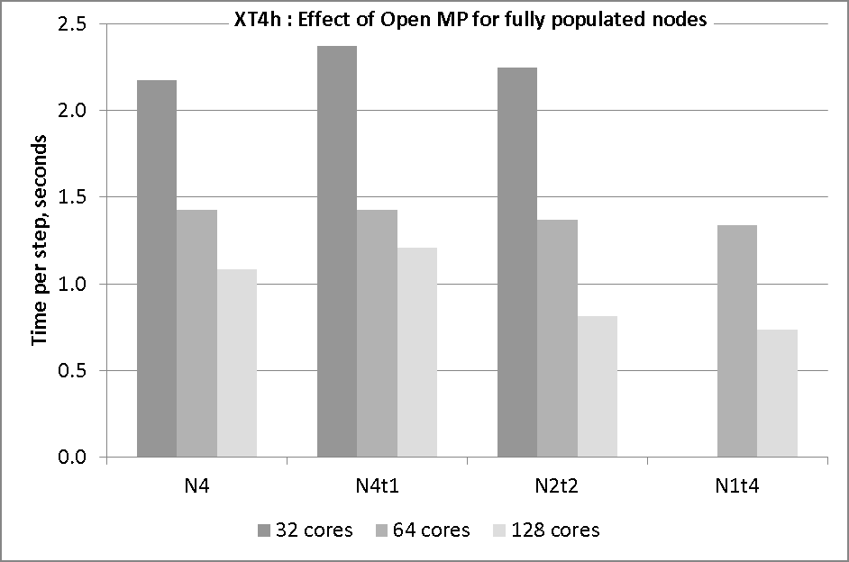 XT6でのテストケースでは、OpenMPによる高速化は32MPIタスクの場合と、64プロセッサへ分解された場合とでは性能が異なりました。前者では2スレッドが最適であったのに対し、後者では3スレッドでした。