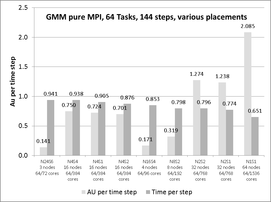 64MPIタスクの場合、最小ノード数は3で、72コアが予約されて8コアがアイドルします。図5では、時間ステップ当りのAU(課金単位)と実行時間の2種類のバーを示しています。これらはステップ時間(第2系列)順に並べられています。最左翼のバーは最高密度のMPIタスク配置です:最初の2ノードは飽和ノードで、残りの一つは8コアがアイドルしています。
