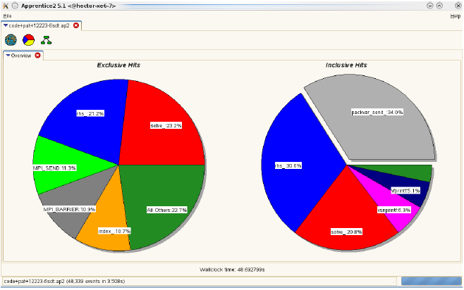 前回と同じ条件での以下のプロファイルから、総実行時間の内MPIが占める割合は3.1%となり、その時間の中でブロッキングMPI_SENDルーチンの占める割合は1%以下になりました。このテストケースの場合、MPI_SENDの実行時間は約18秒から1.8秒へ減少し、全実行時間は230秒から203秒へ減少しました。