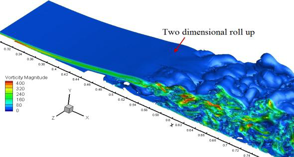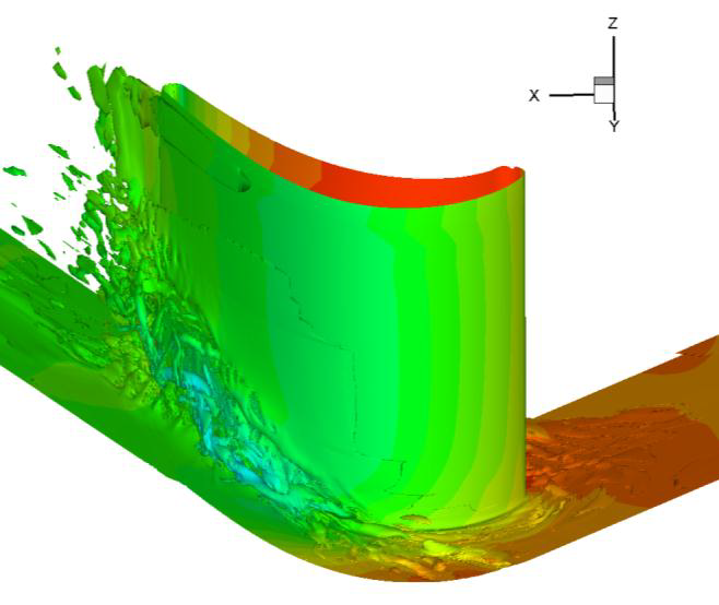 図8は、高圧タービンブレード(HPT)のBOFFSによる計算から得られた瞬間流れ場で、ブレードのスパン方向に生成した、剥離した大規模渦構造を示しています。