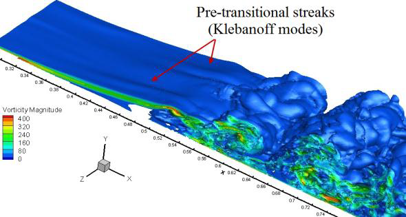 図11は、シミュレーションAとBの測度の等値面を示ししています。遷移前の剥離剪断層はシミュレーションA ではほぼ2次元面であるのに対し、シミュレーションBでは、明らかにスパン方向にうねりが生じています。このうねりは、Klebanoffモードと呼ばれる現象です。乱流解像の成功には、LPTのモデリングに際してこうしたモードを捕捉することが必要となります。