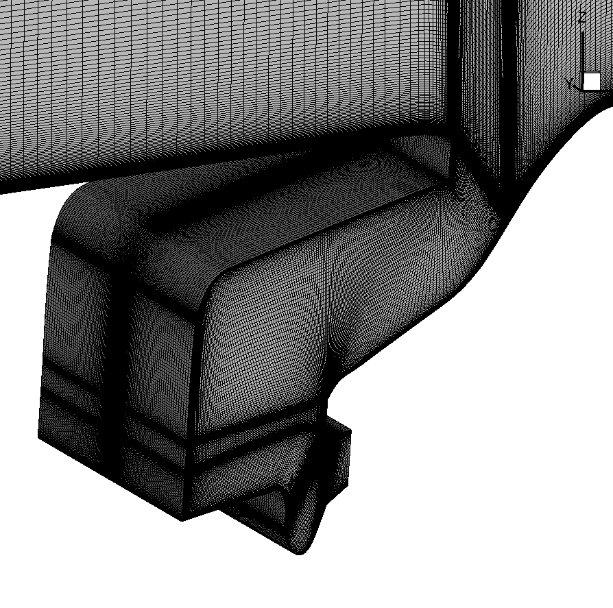 BOFFSは、約22,000行のFortran90コードです。これは、3つの主要セクションに分けられ、各々はシミュレーションの異なるステージとして、グリッド前処理、時間積分、ポスト処理を担当します。分散データ分割では、オーバーセットメッシュの各グリッドブロックが一つのMPIプロセスに割当てられ、そのプロセス内ではOpenMPスレッドのチームが割り当てられています。各MPIプロセスは、メッシュ座標のブロックと境界条件を読み込み、もしリスタートする場合は対応する流れ場ファイルも読み込まれます。この時、前処理は、更なるデータおよび入力デック読み込みと、境界条件設定を行い、メトリックを計算します。新たなメッシュブロックには、このステージでインターフェイス補間データを作成します。補間ファイルを作成したら出力し、引き続くリスタート計算時に用いられます。このセクションのコードは、OpenMPで並列化されており、MPIは用いていません。