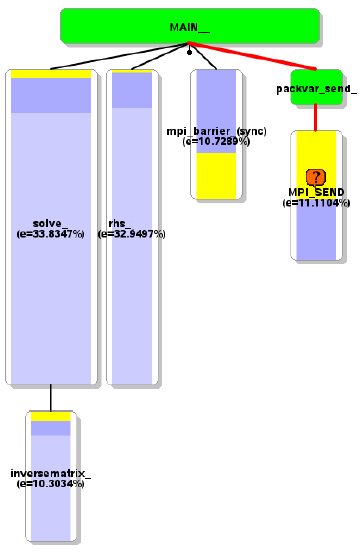 メイン時間ステップ実行時間は大きなサイスの問題に対してスケールしていません。自動プロファイリングツールの結果を図1に示します。同期してMPIバッファーをブロック間に渡ってパッキングするルーチン(PackVar_Send)が、問題です。図2の分析から、大きな負荷分散が生じており、これがMPIの同期時間を大きくしています。