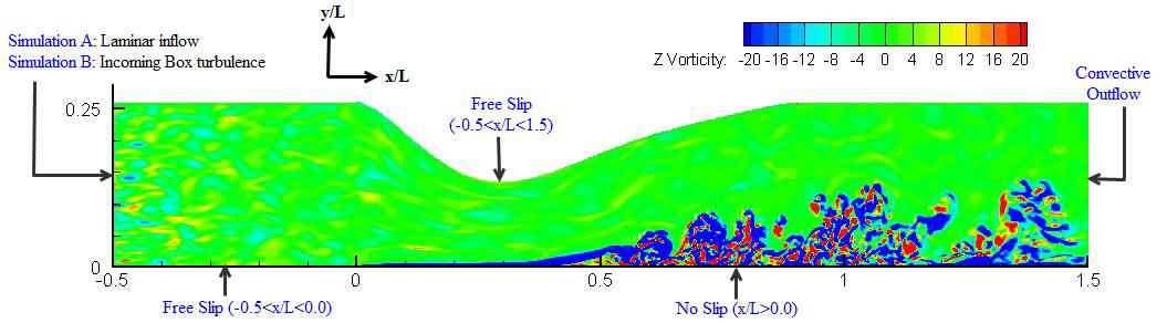 図9:計算領域と境界条件。入力box乱流と共に、z方向の流速のコンターを示しています。