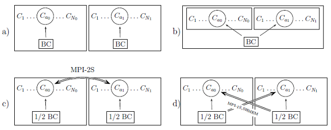 図1 : 各種アルゴリズムでの2タスクのBCデータアクセスパターン。各タスクは格納されたBCを用いて配位$C_1,…,C_{N_t}$をシリアルモードで計算する:a)標準バージョンでは各タスクは自身のBCデータを保持する、b)BCデータは共有メモリーの1セクターに置かれる、c)MPI双方向バージョン:BCデータはMPI双方向通信で転送される、d)MPIあるいはSHMEMで実装された片方向転送。