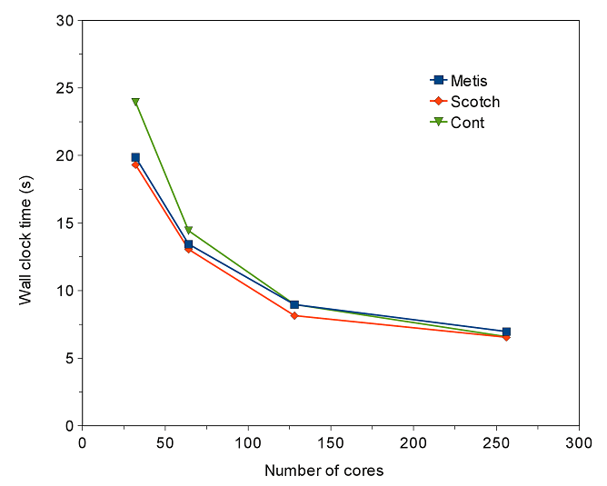 METISとScotchが生成した領域の有効性を比較するために、HECToRフェーズ2a.Aのクアッドコアノードを用いて、32,64,128,256コアについてテストを行いました。テストにおいては、100000六面体有限要素の固定グリッドが分割され、並列CABARETコードで使用可能な分散されたメッシュを生成することとします。ここでMETISとScotchおよび連続領域分割を用いました。METISとScotchの領域分割は本レポートの先に述べた方法を用いて実行されました。