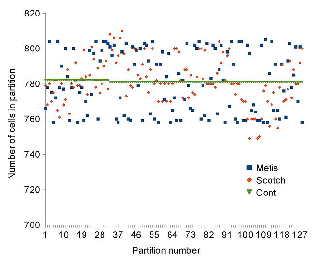これでhexcells.mapの内容には、セル総数(例えば100000)およびセル番号とその対応する0〜127の領域番号が含まれます。このセクションでは、スタンドアロンのScotchアプリケーションgtstとgmapを用いましたが、ユーザ自身のFortran(あるいはC)コードへScotchライブラリをリンクすることも、サブルーチンとしてSCOTCH_graphCheckやSCOTCH_graphMapを使うことも可能です。