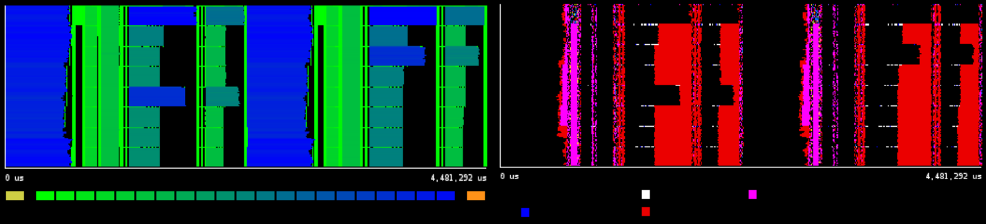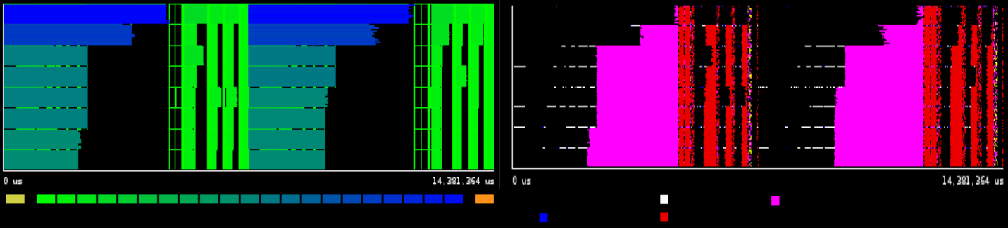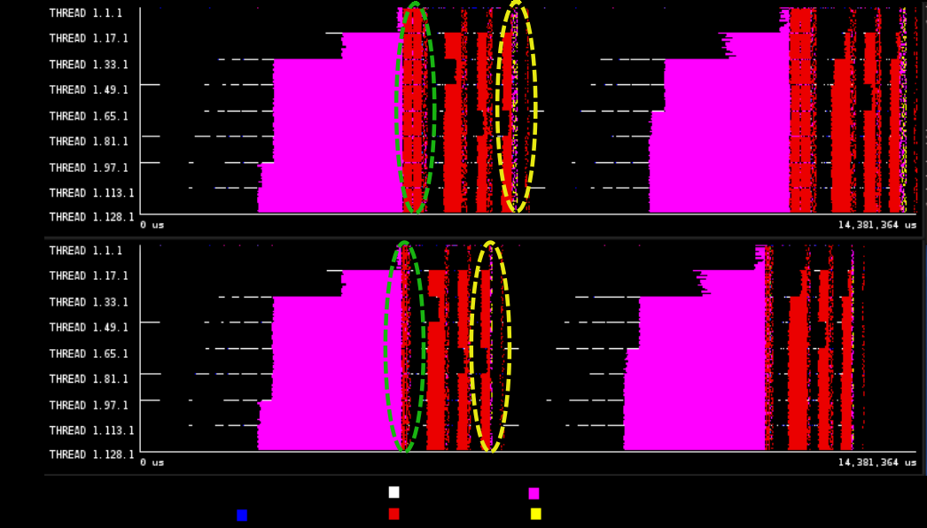 図10は、理想的なネットワーク(レイテンシーがゼロ、無限に広いバンド幅)を用いた場合のROI2性能の改善を示しますが、理想と実際の値の間には、数か所で1種類のMPI時間の改善しか在りません。これは、MPIの時間の殆どが負荷分散で生じているためです。しかしながら、他のランクがバリアで待機している間にMPI Allreduceを実行するノードマスタのパターン(図10の緑色の囲み)が明らかに減少しています。これは、待ち合わせ時間の主な原因がその領域で転送されるデータの量であることを示します。
