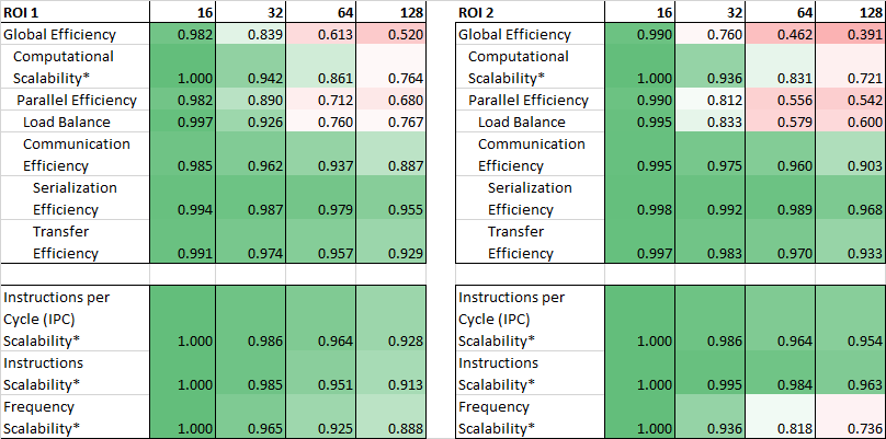 このセクションでは、図3に示された計算の非効率性に焦点を当てます。指標については、Load Balanceとthe Computational Scalabilityという2つが問題となりました。ここでは、より性能が悪い方のROI2に焦点を絞って分析を進めます。2つのROIはよく似た傾向を示しているため、分析は両方に関係します。