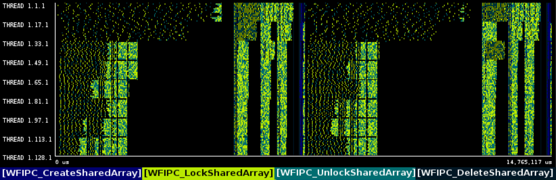 図4: 128コアを用いたROI2のPOSIX共有メモリー配列ルーチン呼出しのタイムライン